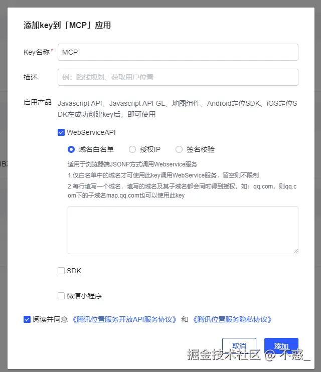 腾讯位置服务MCP Server(SSE)依赖WebServiceAPI构建,因此需要先创建key,并开启WebServiceAPI功能,取得相关接口调用配额后方可使用,
