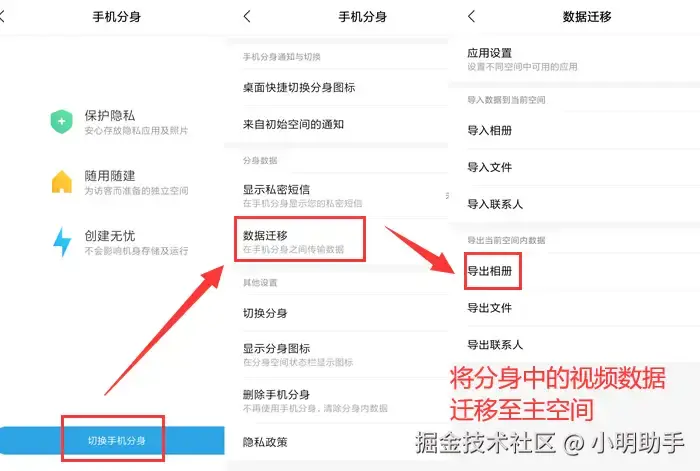步骤:找到手机设置中的【手机分身】,切换到另一空间,找到【数据迁移】,把需要的视频转移到主空间中。