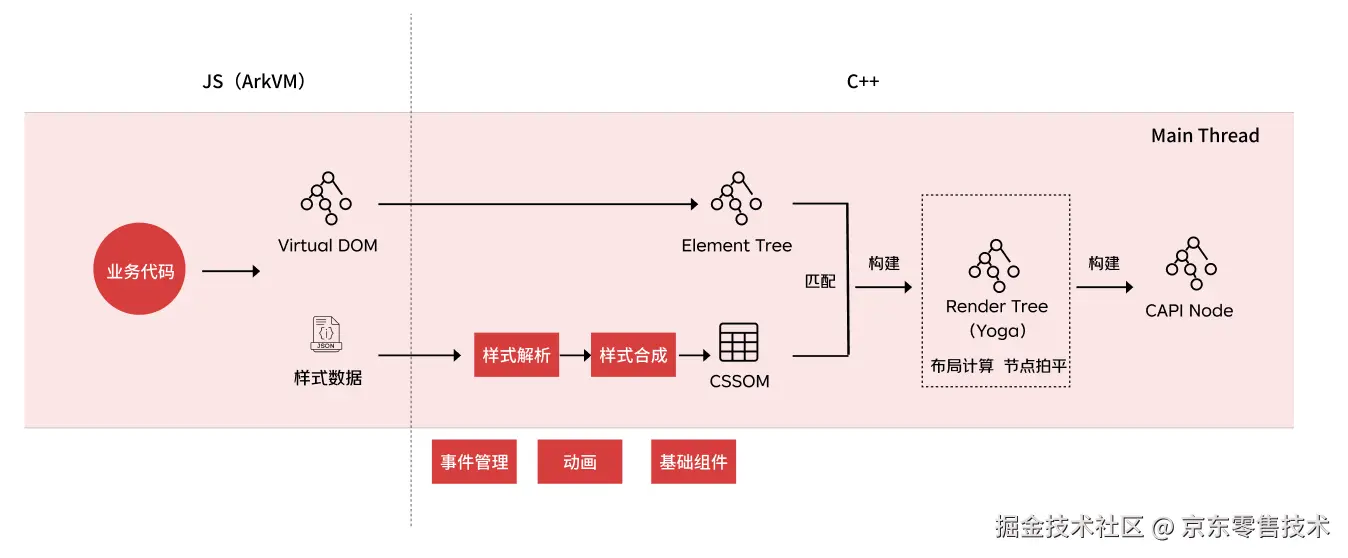单线程架构版本的示意图如下,整个渲染过程均在主线程实现,业务代码在 ArkVM 中执行获得虚拟 DOM 树,同时读取样式数据,通过 React Reconciler ,在构建虚拟树时会调用 NAPI 在 C++ 侧构建出对应的 Element Tree,同时也会进行样式数据的解析处理,从而构建出 CSSOM 对象,Element Tree 和 CSSOM 对象会进行匹配从而构建出带有样式的 Render Tree,在这一步也会同时创建 yoga 节点,进行布局计算,最后会再基于布局计算的结果生成 C API 的 ArkNode Tree,从而实现上屏渲染。