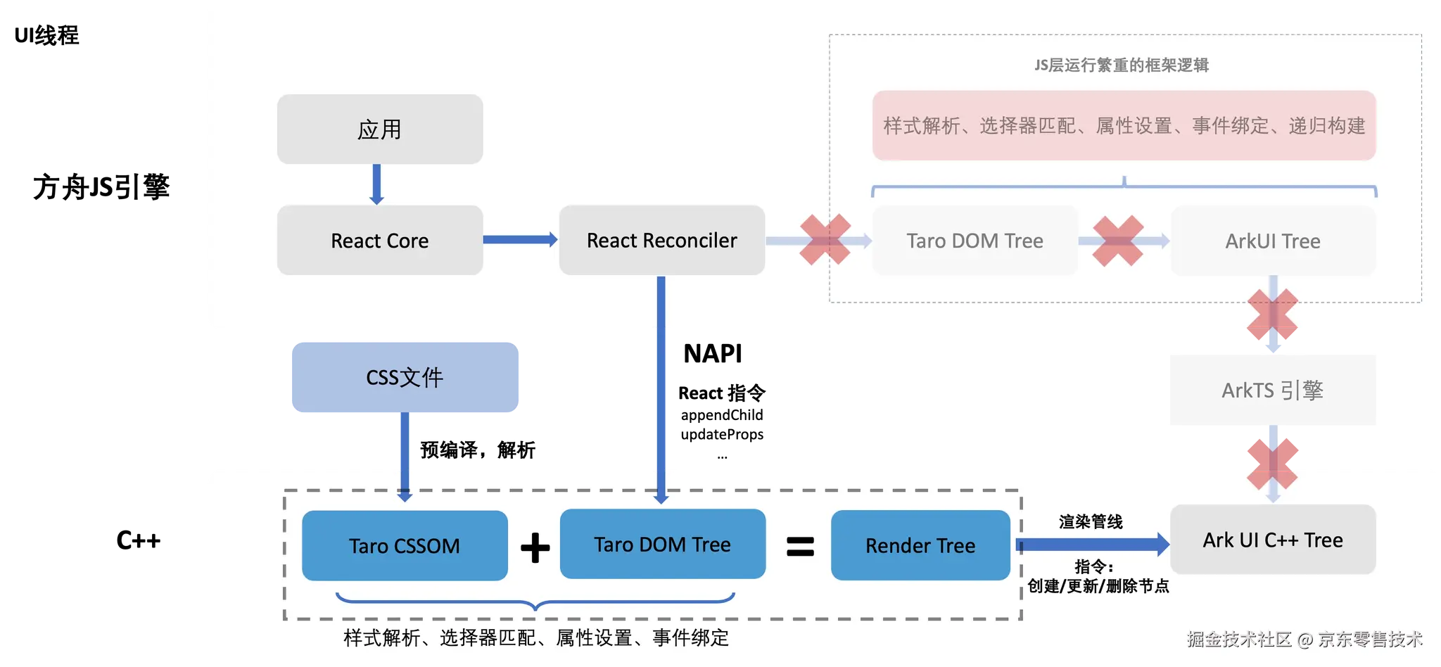 另一方面,在 C++ 侧 Taro 会指令式地调用 ArkUI 在 C++ 侧提供的 API,来高效地创建节点、设置属性、绑定事件以及绘制上屏。