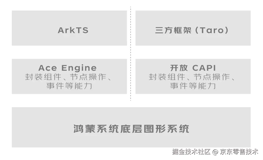 恰逢此时,鸿蒙为了方便三方框架与应用接入鸿蒙生态,在官方开发语言 ArkTS 之外,开放了更底层 C API 能力,提供了 C++ 层的 UI 节点创建、属性设置等能力(类似于 C++ 版本的 DOM),三方框架和应用可以基于 C API 构建高性能的解决方案和应用。