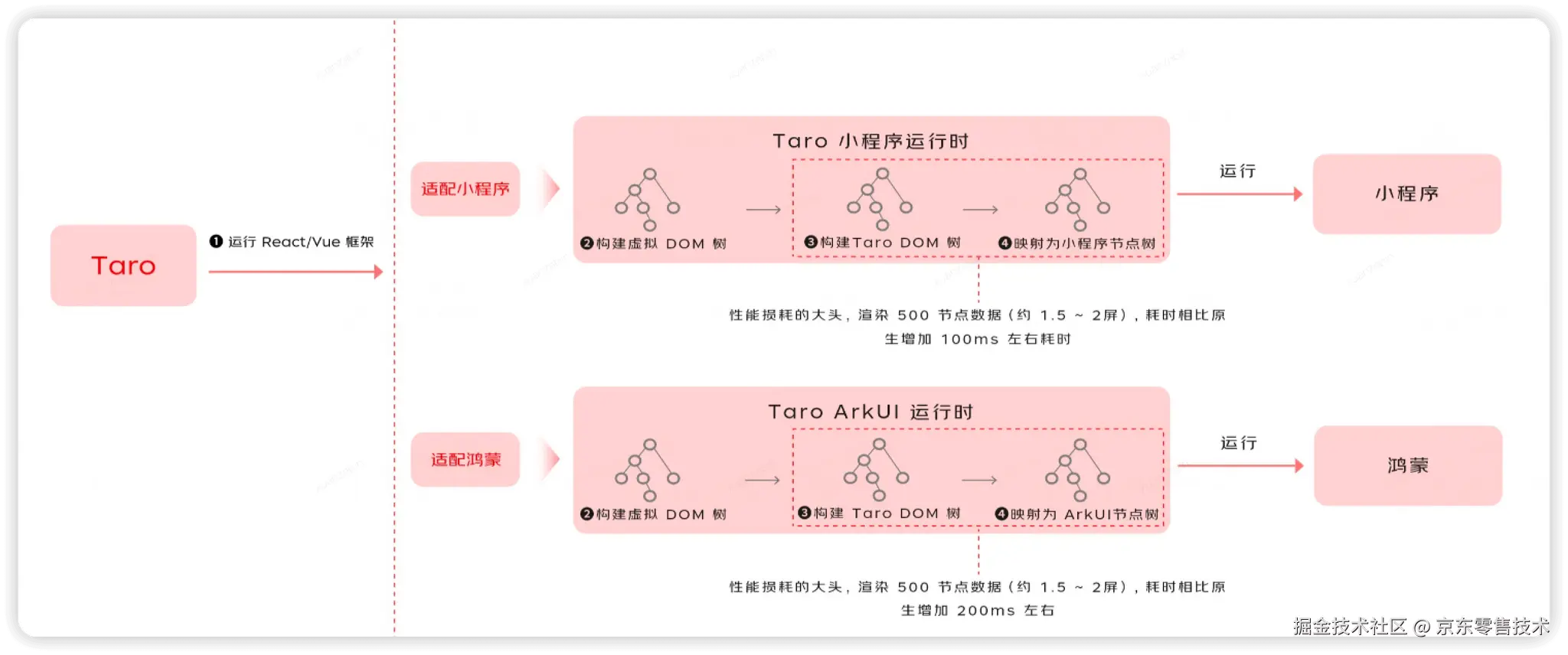 Taro 适配鸿蒙方案经过了多个版本的演进迭代,最初版本我们采用的是对接到鸿蒙原生 ArkTS 语言的方式来实现,这和 Taro 适配微信小程序的方案类似,都是通过模拟浏览器 DOM/BOM 环境,然后运行 React 代码构建出虚拟 DOM 树,再将虚拟 DOM 树以递归遍历的方式构建出宿主环境(小程序/鸿蒙)的渲染节点树,从而实现页面渲染。