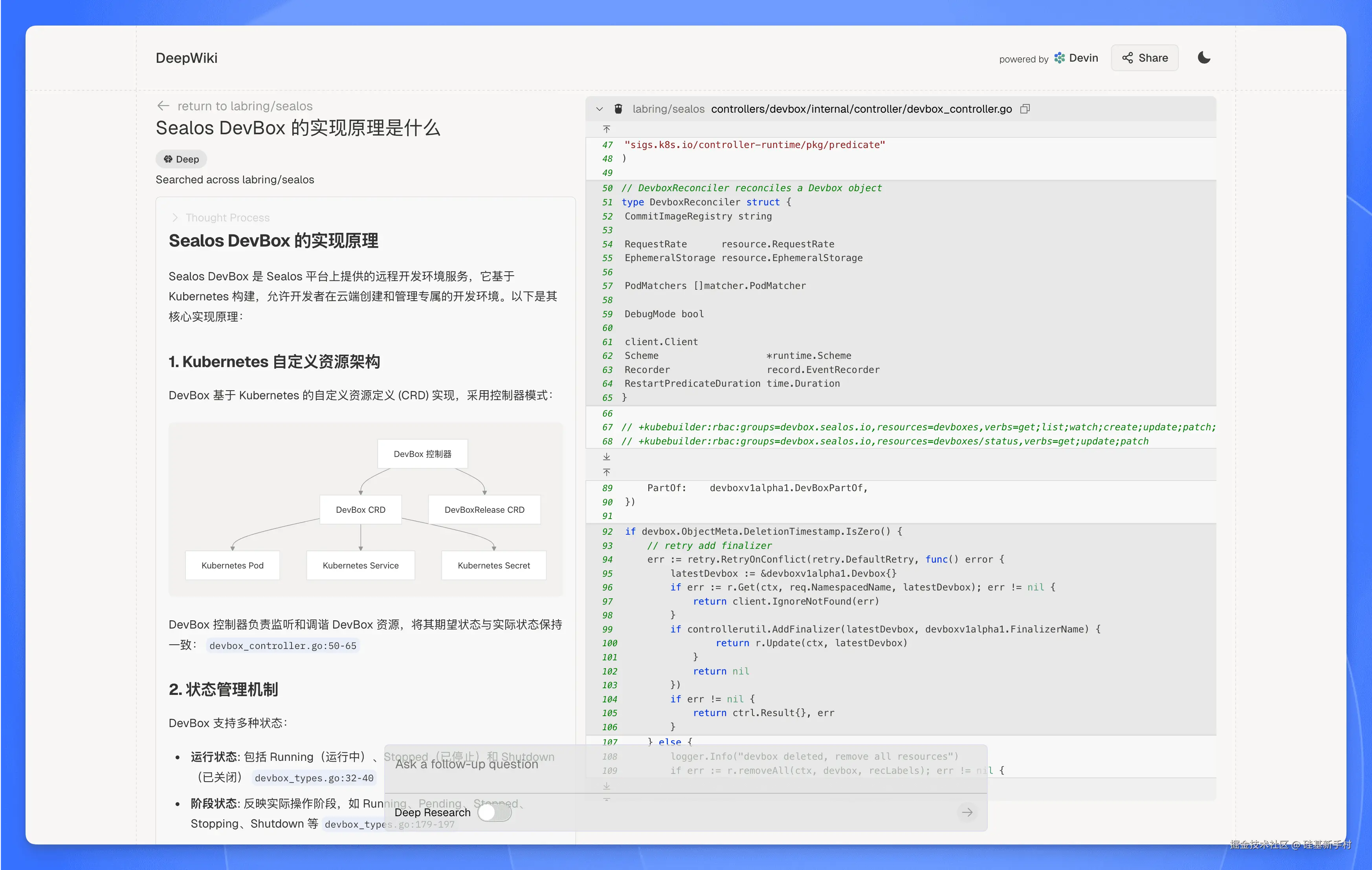 我拿 Sealos 的 GitHub 仓库 试验了一下,确实有点惊艳到我了,整个页面层次清晰,还有很多可视化架构图(Sealos 项目本身并没有提供),每个章节都有相关的资料来源,非常方便查阅。