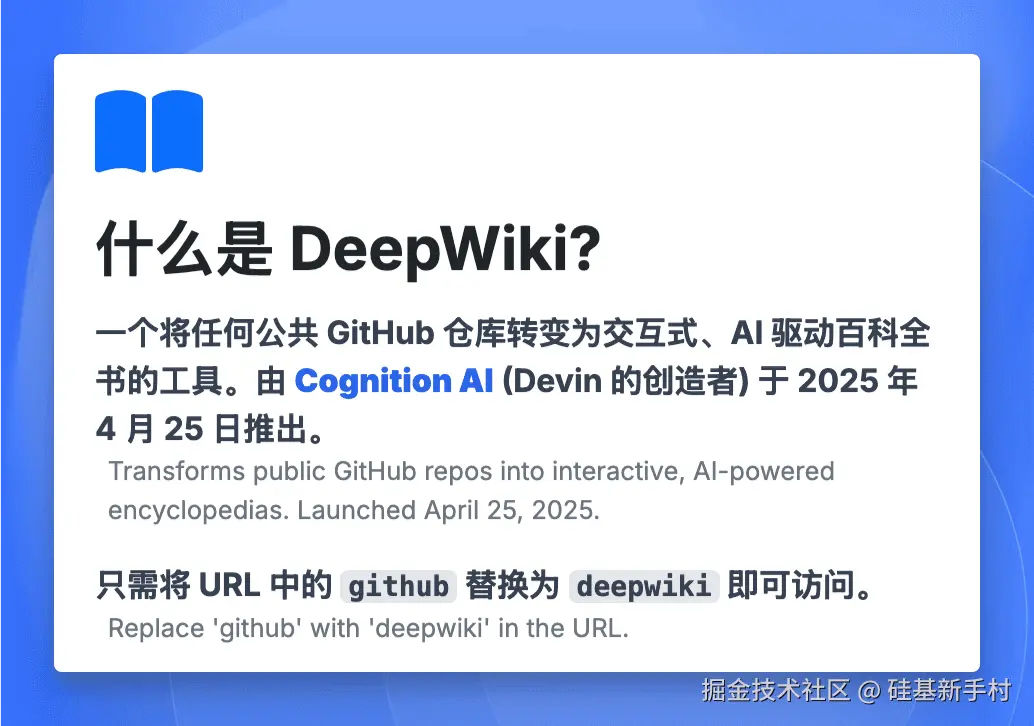 DeepWiki 不仅仅是简单地展示代码,它用 AI 的力量,将代码仓库变成了一本活的、可交互的百科全书。