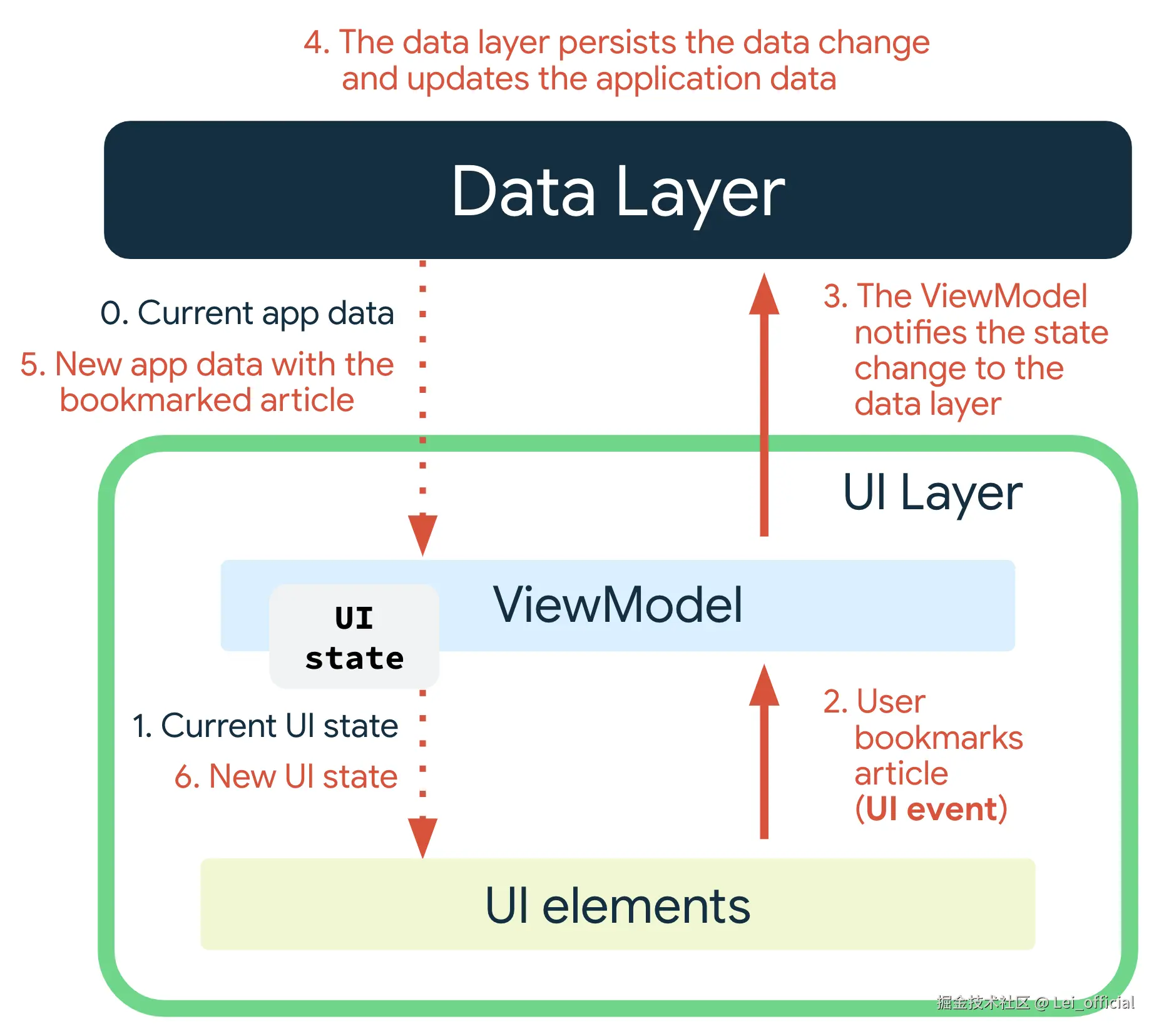 ViewModel持有并维护UI State,其数据来源是底层的数据仓库。UI层负责将用户交互事件告知ViewModel。ViewModel的业务逻辑代码处理用户交互事件,如果有状态更新,则将该状态更新通知数据仓库。- 数据仓库在接收到更新请求后,把新生成的不可变数据发射给
