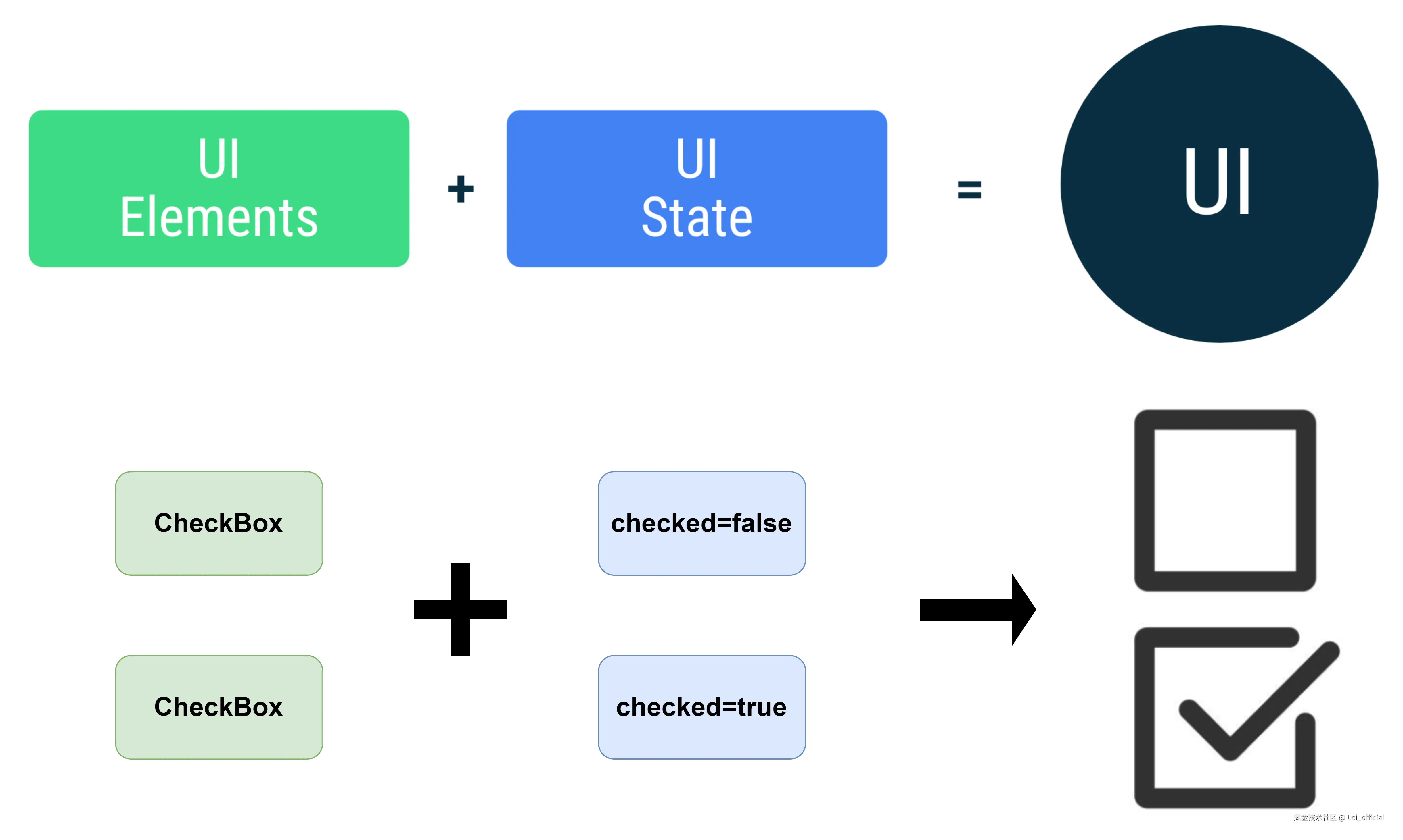 用户在界面上看到的 UI 由两部分组成,分别是 UI 元素(UI Elements) 和 UI 状态(UI State),以界面上展示中的一个 CheckBox 为例,它本身是一个 UI 元素,而根据数据源所保存的数据不同,可以将自身展示为 Checked 和 Unchecked 两种状态,如下图。
