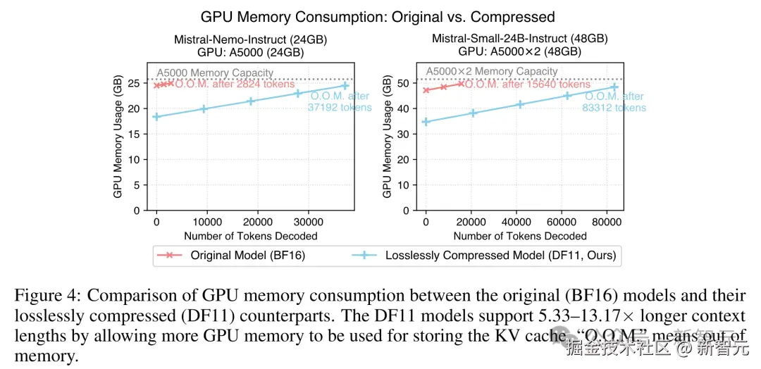 DF11 压缩带来的显存节省不仅减少了推理所需的 GPU 数量,还支持更长的生成长度。