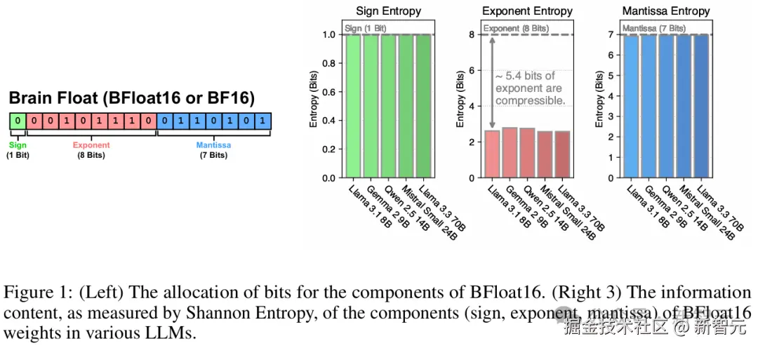 为了推动 LLM 权重的无损压缩,团队分析了最新 LLM 权重中 BFloat16 各个组成部分(符号、指数和尾数)的可压缩性。