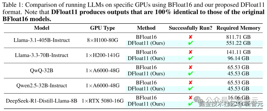 特别值得一提的是,DFloat11 成功地实现了 Llama-3.1-405B(810GB)在单节点上(8 块 80GB GPU)的无损推理。