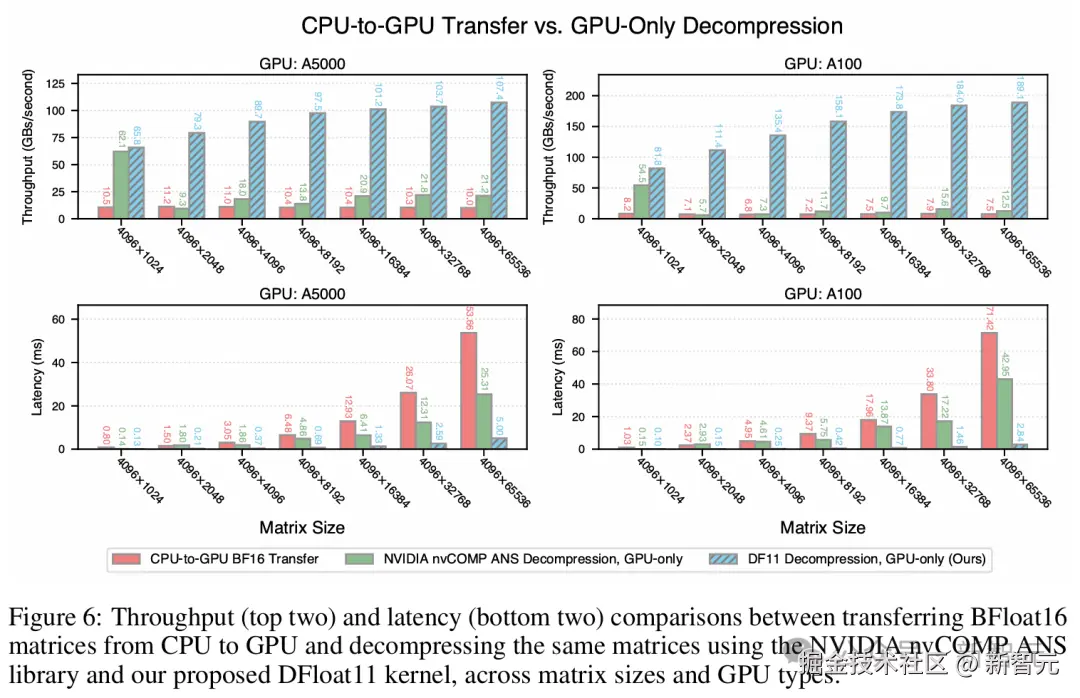 图 6 展示了这种现象,它表明解压缩的吞吐量会随着矩阵尺寸的增加而显著提升。为了充分利用这一特性,研究团队建议将多个矩阵的解压缩操作进行批处理,以此来提高吞吐量并隐藏延迟。