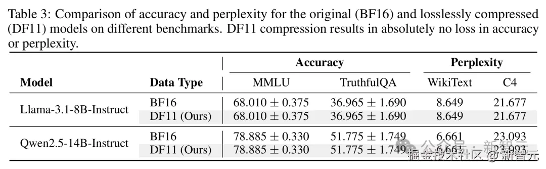为了进一步验证无损特性,他们将 DF11 解压后的 BF16 权重矩阵与表 2 中各模型的原始权重矩阵进行比较,确认两者在比特级上完全相同。