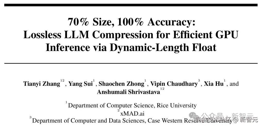 【新智元导读】LLM 的规模爆炸式增长,传统量化技术虽能压缩模型,却以牺牲精度为代价。莱斯大学团队的最新研究 DFloat11 打破这一僵局:它将模型压缩 30% 且输出与原始模型逐位一致!更惊艳的是,通过针对 GPU 的定制化解压缩内核,DFloat11 使推理吞吐量提升最高 38.8 倍。