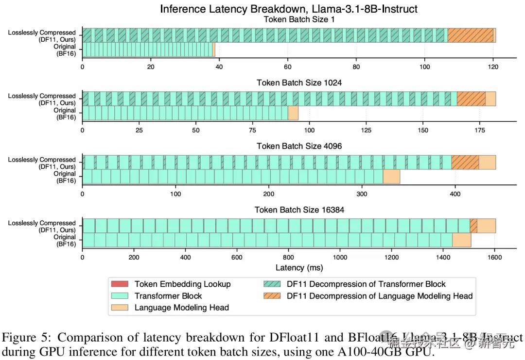 图 5 展示了在不同的批处理大小下,使用 DFloat11 压缩的 Llama-3.1-8B-Instruct 模型的延迟细分情况。