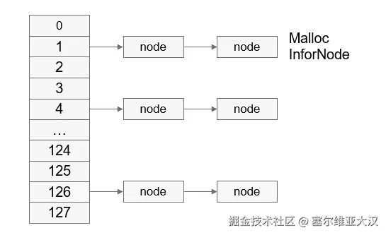 申请内存时:保存关键信息到内存节点控制块,根据当前线程ID将内存节点控制块挂到对应链表;