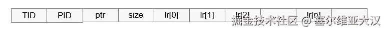 其中,TID表示线程ID;PID表示进程ID;ptr表示申请的内存地址;size表示申请的内存大小;lr[n]表示函数调用栈地址,变量n的大小可以根据具体场景的需要进行配置。