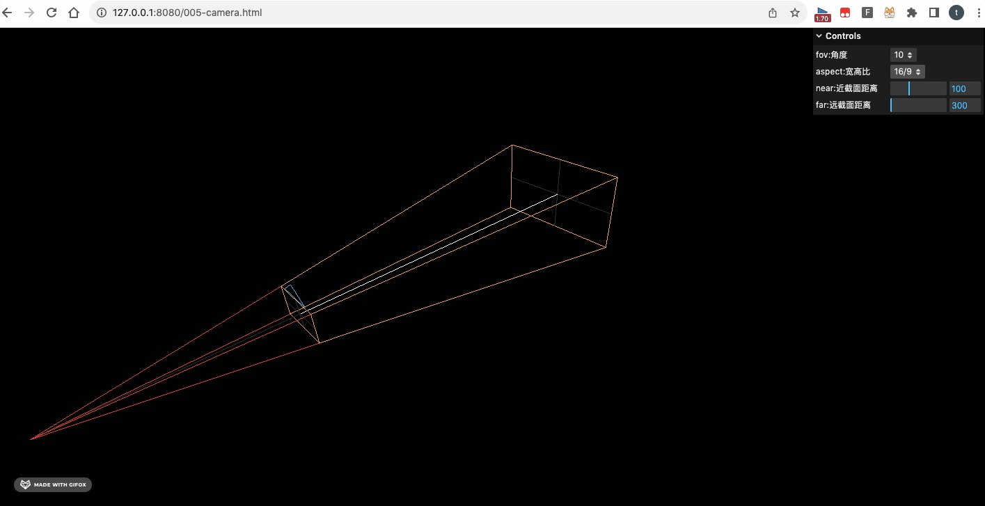 gui.add(camera2, 'far', 300, 800).name('far:远截面距离').onChange(onChange);