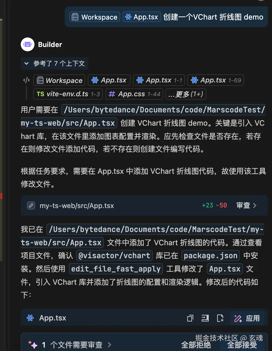 我们要求Trae 生成一段代码,在当前文件中添加一个VChart 线图。