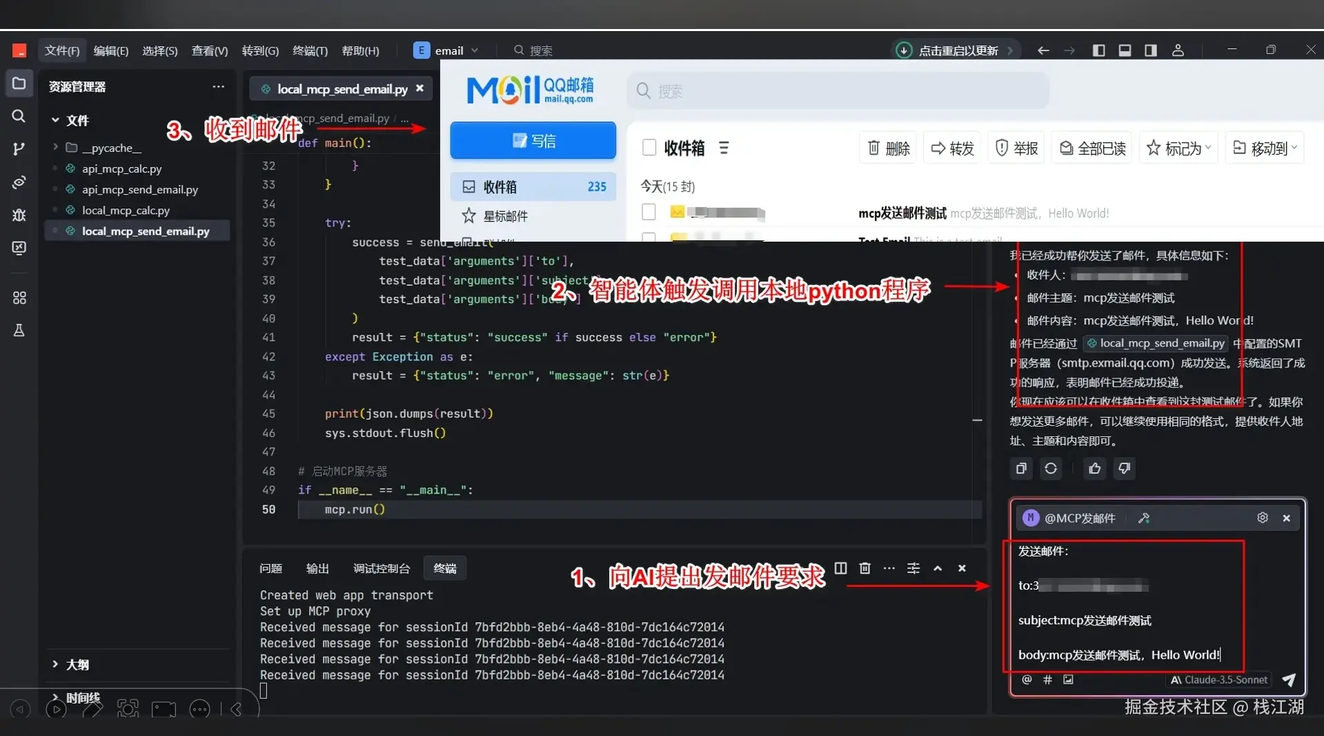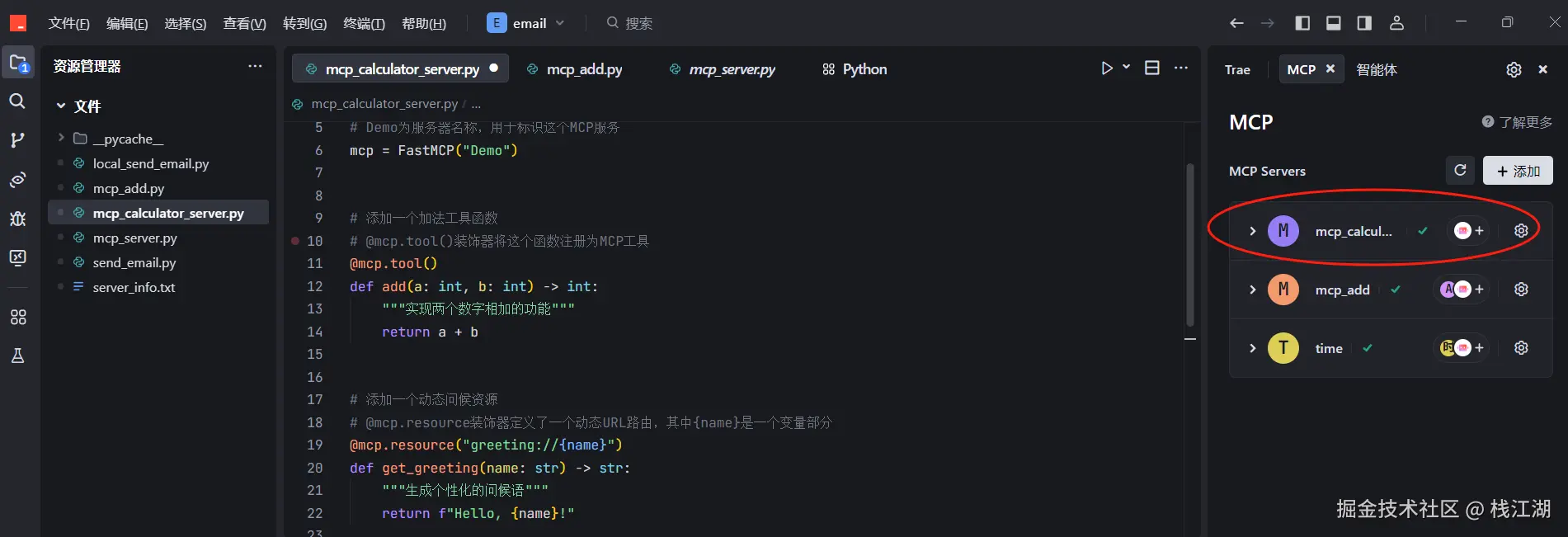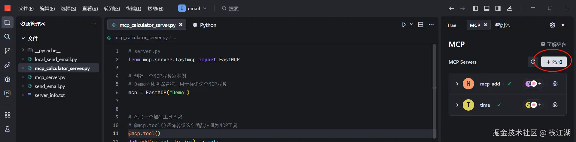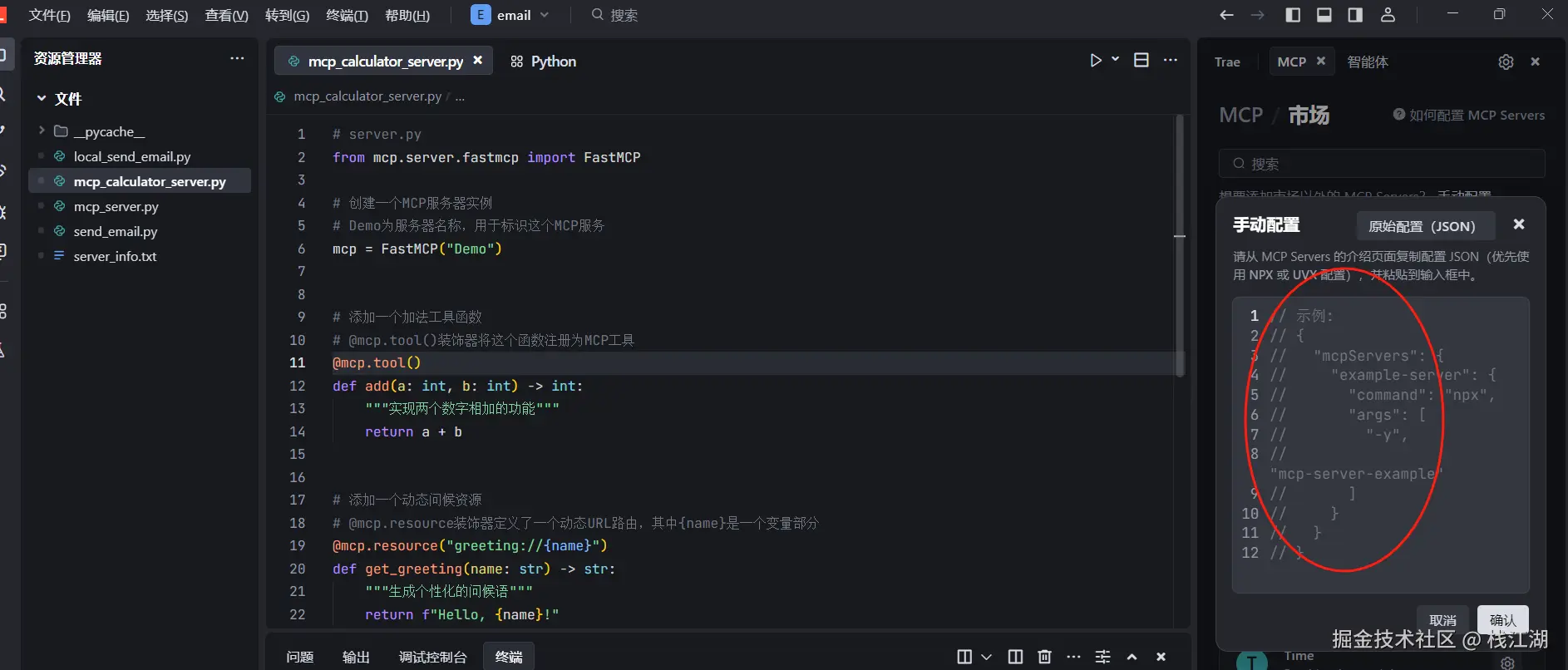下面是如何基于 Trae 使用 Python 编写一个“发邮件”的 MCP 插件的过程。