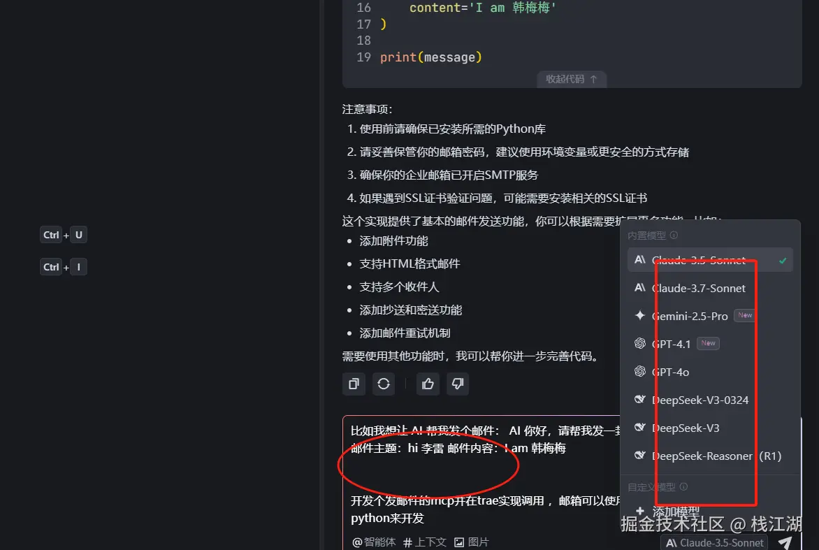 把自己的需求告诉 Trae,选择一个模型就可以生成发邮件的 mcp server 代码