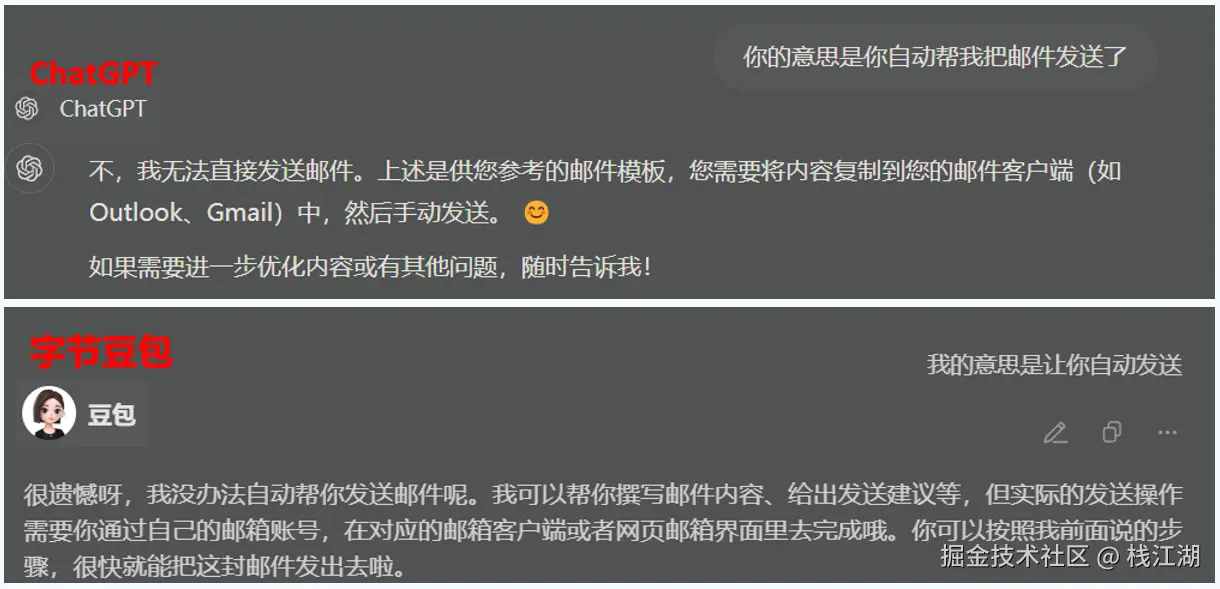 一般来说互联网版本的 AI 可以帮我们拟邮件内容与标题,但不会给我们自动发邮件,毕竟这操作就和病毒一样有点可怕。当然如果是在自己本地的私有化 AI 来说这就是可以实现的功能。