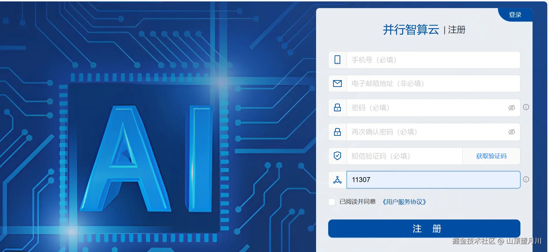 访问并行智算云官网,填写11307,充多少返多少。完成注册并登录。ai.paratera.com/#/registerhttps://ai.paratera.com/#/register