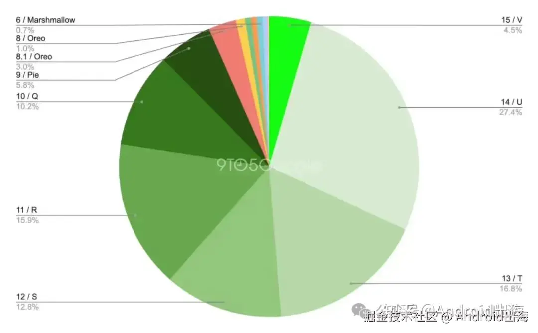 此外,Android 8.0 及以下版本的占比均未超过 3%,其中 Android 5 Lollipop 和 Android 4.4 KitKat 仅占 0.1%,几乎被市场淘汰。