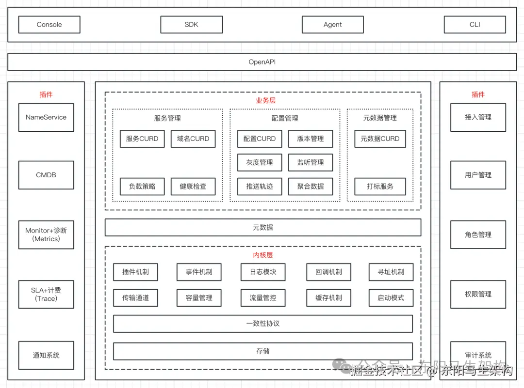 整体架构分为用户层、业务层、内核层和插件。用户层主要解决用户使用的易用性问题,业务层主要解决服务发现和配置管理的功能问题,内核层用来解决分布式系统⼀致性、存储、高可用等核心问题,插件用来解决扩展性问题。