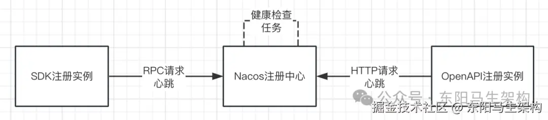 在Nacos中,从注册方式维度可以将服务的注册分为两大类。⼀是SDK方式,通过RPC连接进行注册。二是OpenAPI方式,通过IP + 端口进行注册。