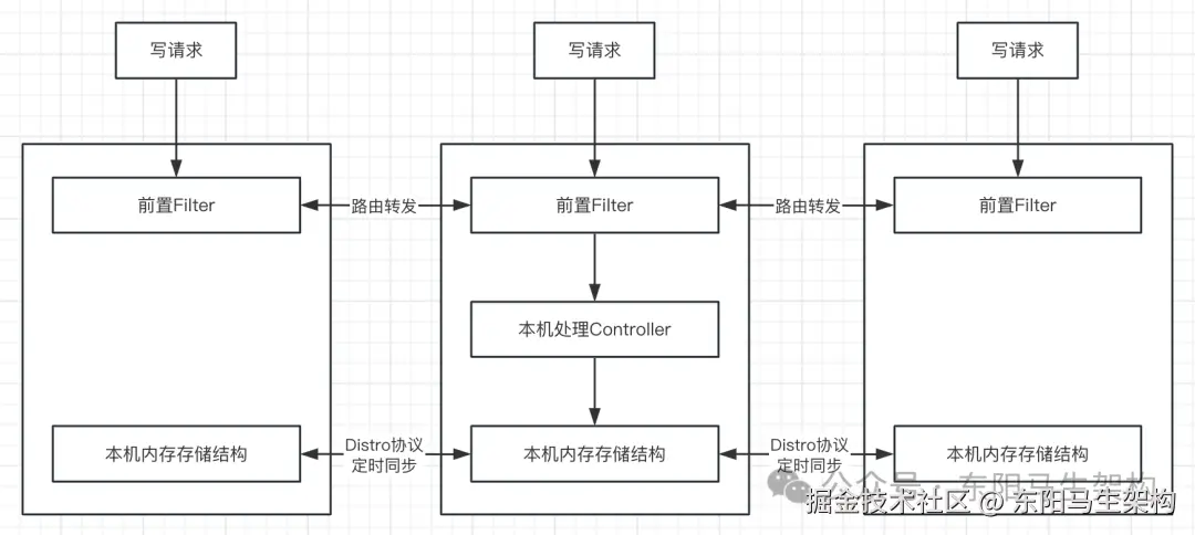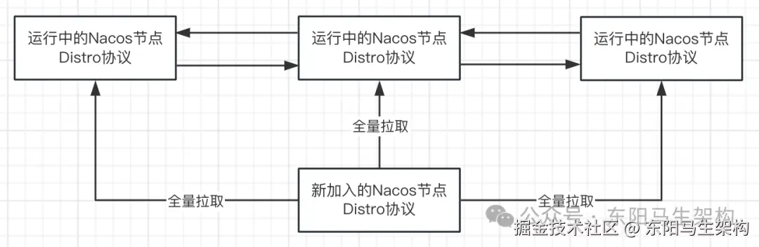 每个注册中心节点都会在启动时启动⼀个全局的同步任务,用于将其负责的所有服务实例信息同步到集群中的其他注册中心节点上。
