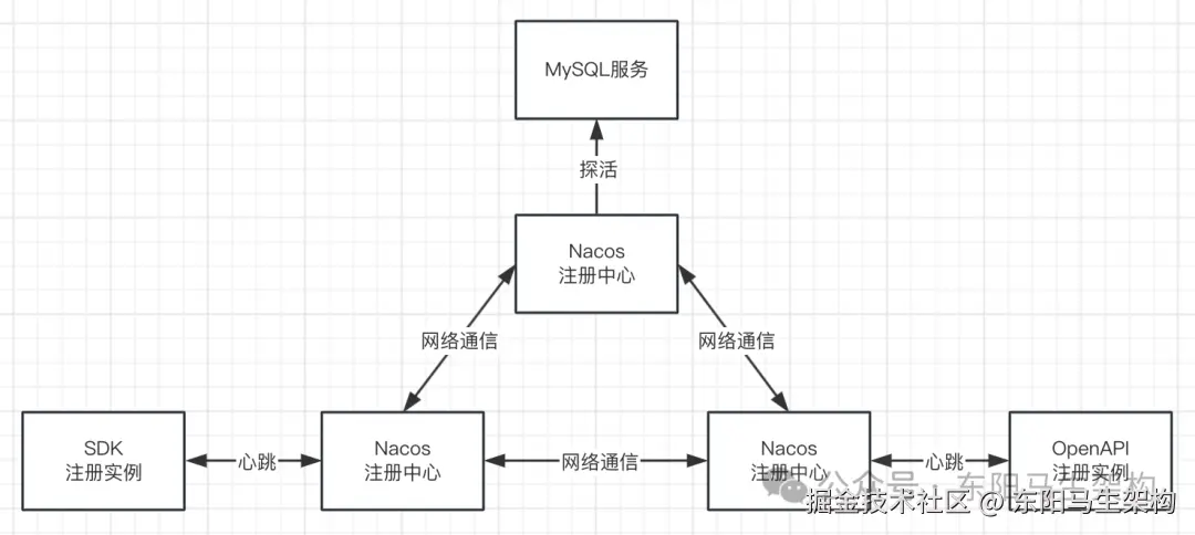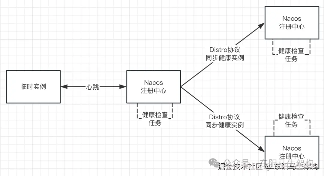 所以临时服务实例只会对负责自己的某个注册中心节点发送心跳信息,而一个注册中心节点只会对其负责的持久化服务实例进行健康探测,在获取到健康状态后再将健康信息同步到集群中的其他注册中心节点。