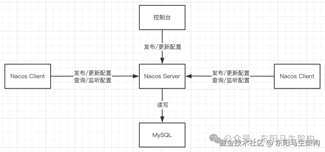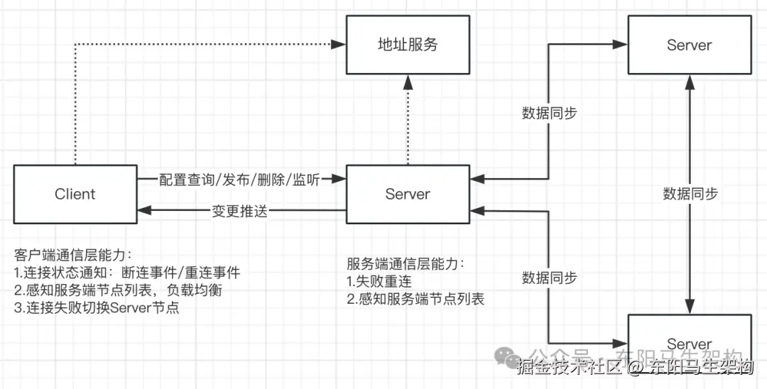 ⼀致性的核心是Server与DB保持数据⼀致性,从而保证Server数据⼀致。Server之间都是对等的,任何⼀个Server在处理配置数据的写入请求时,会先将数据持久化到DB,持久化成功后该Server再异步通知其他Server到DB中拉取最新的配置数据。