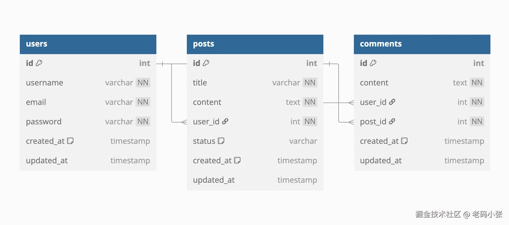 你可以看到用户与文章、评论之间的一对多关系,以及文章与评论之间的一对多关系。