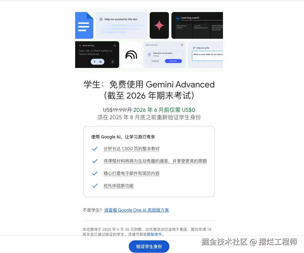 刚好买了半年的Gemini Advance到期了,续费时发现有个学生优惠: 学生可以免费使用 Gemini Advanced 1 年。