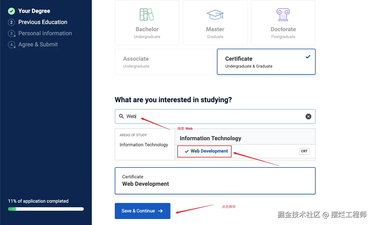 要读什么专业呢?你可以跟我一样,在这里搜索 Web,接着选择 Web Development 就行。当然,你也可以选择其他的专业方向。