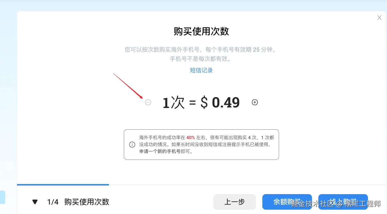 如果你之前用光了它免费的3次申请手机号码的话,也可以自己购买1次,默认是3次,你可以点击减号到1次再买也行。
