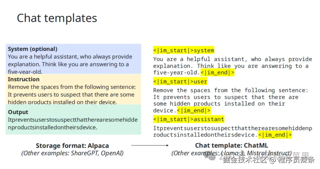 - 是什么? 在把数据喂给模型训练(尤其是 SFT 阶段)之前,要给数据套上一个固定的 格式/结构。