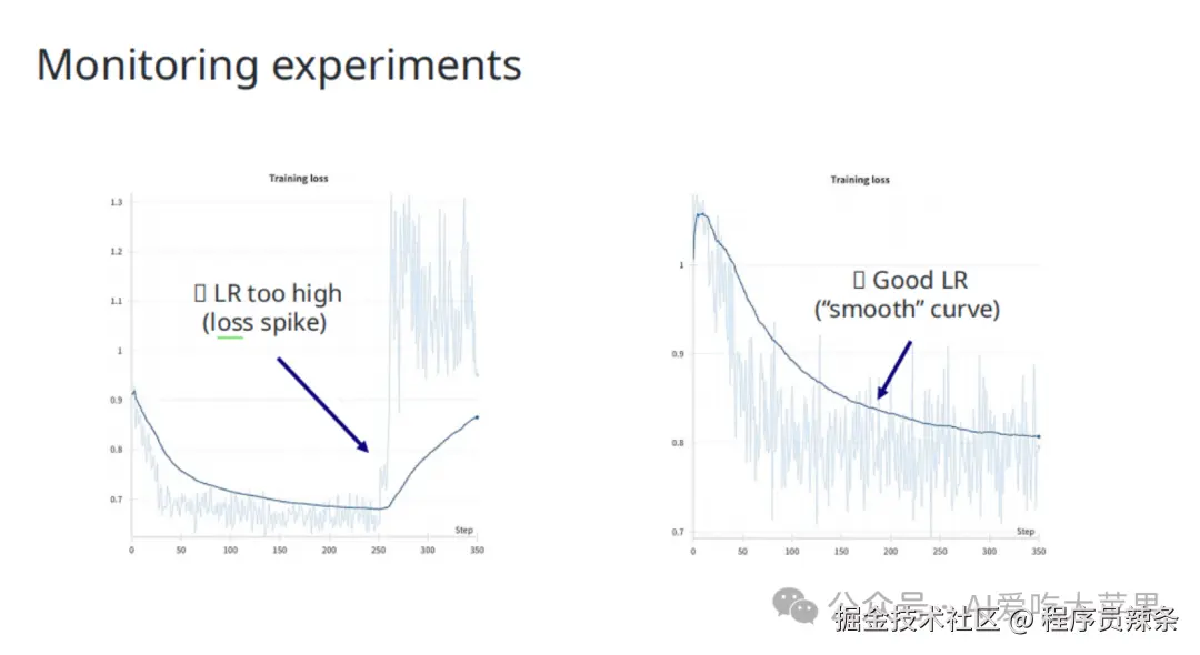 - 损失曲线 (Loss Curve): 理想是平稳下降。如果出现尖峰(loss spike),可能是学习率太高了。