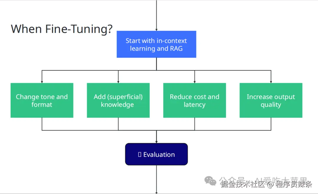 - 什么时候微调? 如果简单方法效果不够好(比如答案质量、速度、成本不满意),可以考虑微调。以下情况适合微调: