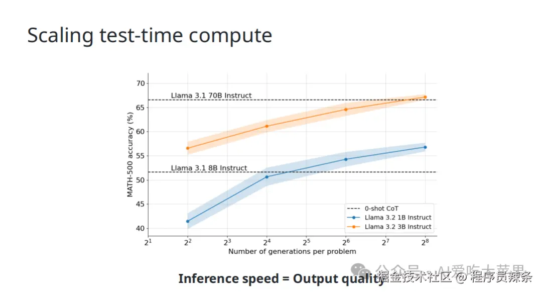 - 效果: 实验表明,小模型(如 Llama 3.1 3B)通过在测试时生成更多候选答案(增加计算量),可以在某些任务(如数学)上 超过 比它大得多的模型(如 Llama 3.1 70B)。