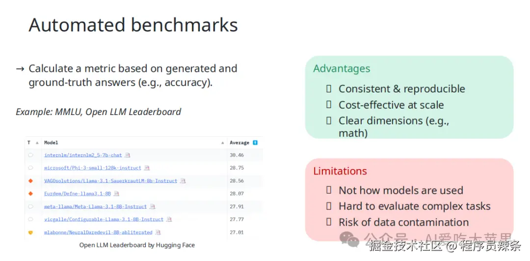 - 结论: 不能只依赖一种评估方法。需要 结合使用 多种方法(比如自动化基准 + LLM 裁判 + 少量人工抽查)来更全面地了解模型表现。