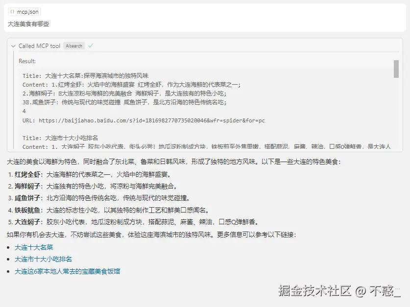 result = await client.call_tool("AIsearch", {"query": "大连美食有哪些"})