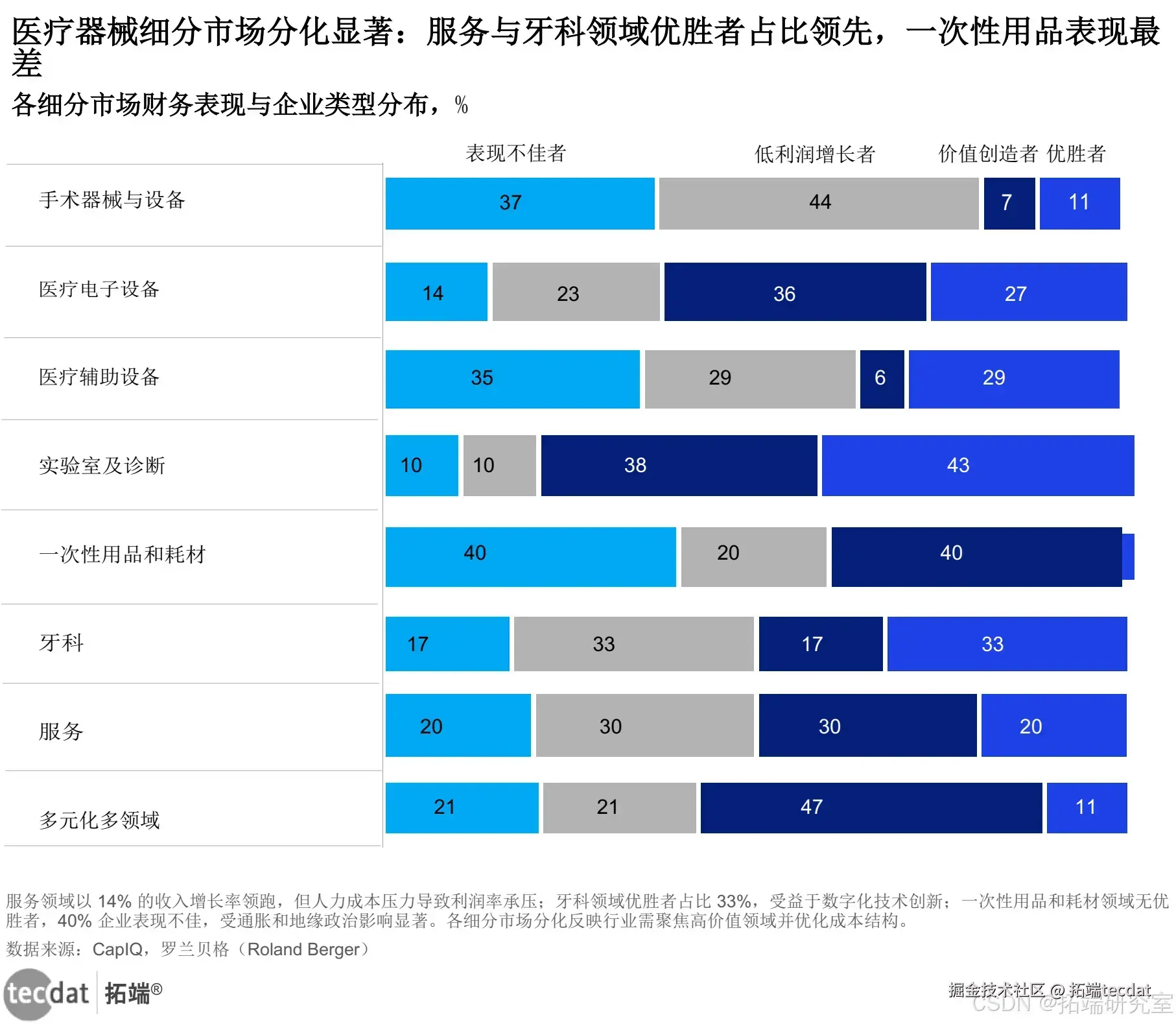 不过,在这一过程中也出现了企业分化的现象。那些能够聚焦高增长细分领域,如牙科、服务领域,并且通过AI驱动的产品平台化创新,像达芬奇手术机器人那样实现差异化的企业,成为了行业的优胜者。它们年均营收增长率可达16%,研发投入占比7.3% ,销售成本(COGS)占比48% ,市值规模达1158亿欧元,展现出强大的竞争力。