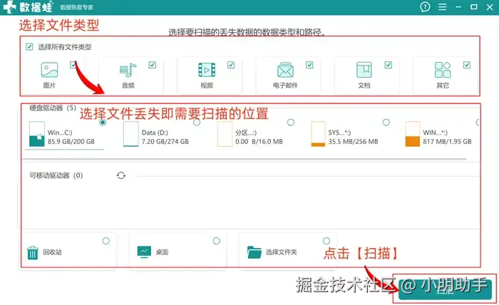 步骤1: 进入软件的首页后,在上方可以选择需要找回的文件类型,然后在中下方选择扫描的位置,完成选择后再点击【扫描】的按钮;