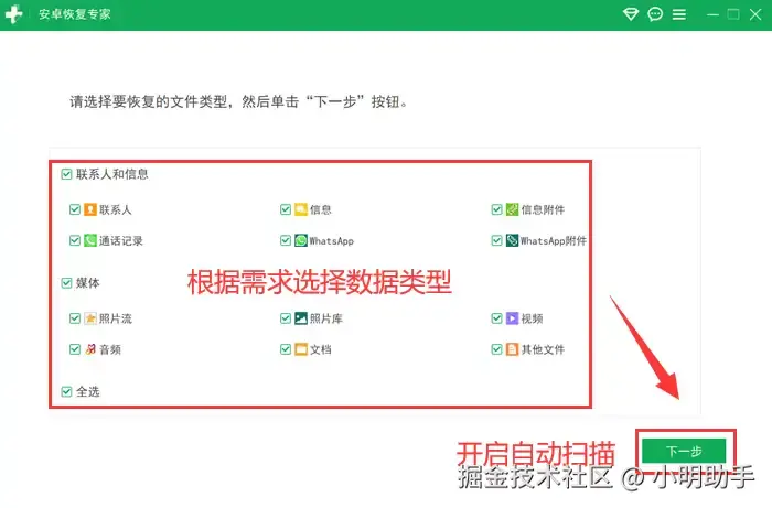 步骤3: 根据文字指引,选择你需要的数据类型,比如说【短信】、【联系人】之类的,将它们勾选,再点击【下一步】,就可以开启自动扫描。