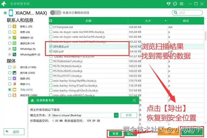 步骤4: 等待一段时间,扫描结果将会呈现在屏幕上。此时,放心选择你需要的数据吧。通过浏览、搜索、筛选等方式,快速确认要找回的项目,最后点击【导出】,选定保存位置,点击【恢复】就行!