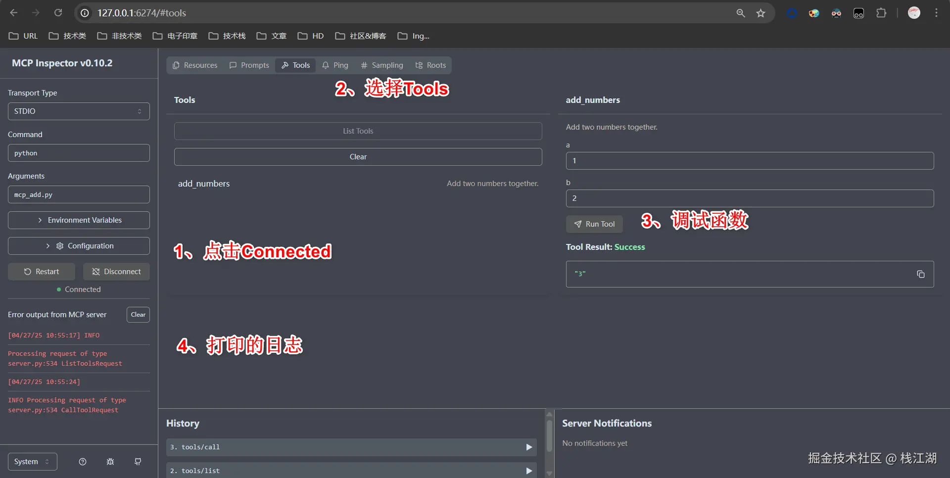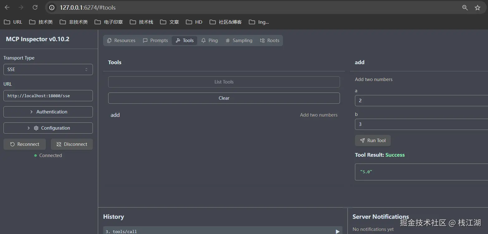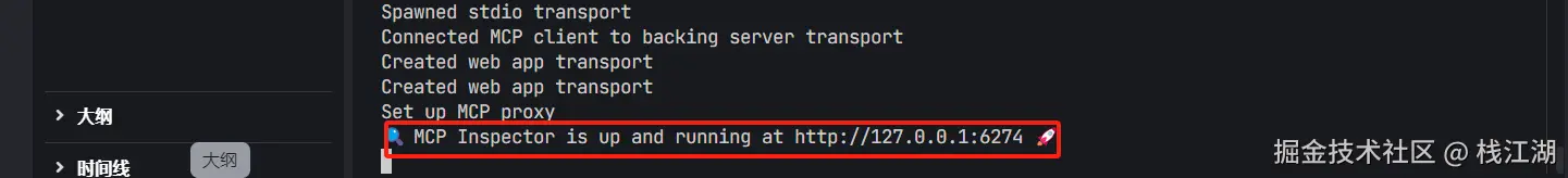 一般来说写完的代码可以使用 MCP 官方提供的测试工具先来调试自己的程序,这里可以直接调用和看日志