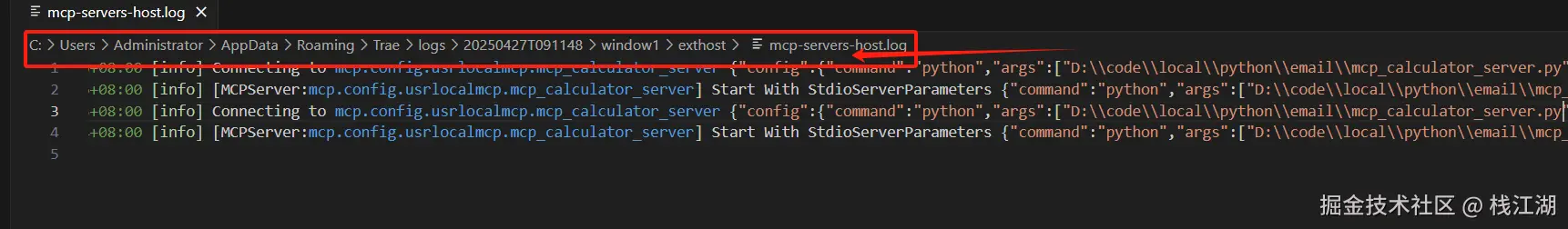 日志文件为 MCP-servers-host.log,在 MCP 里 Trae 或 cursor 就是 host