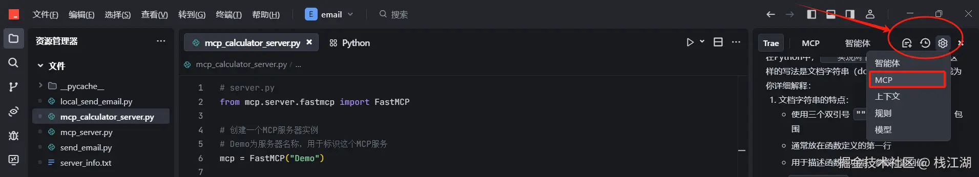 代码编写好后,在 Trae 里选择"设置",再选择 MCP