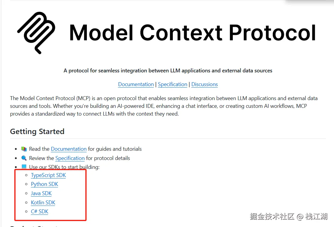 代码使用了 MCP 官方的 python SDK,也就是使用 MCP 的话我们可以使用现存官方提供的 SDK 不需要我们自己去实现。官方有提供 ts、python、java、kotlin、C#的 SDK 及相应的 demo