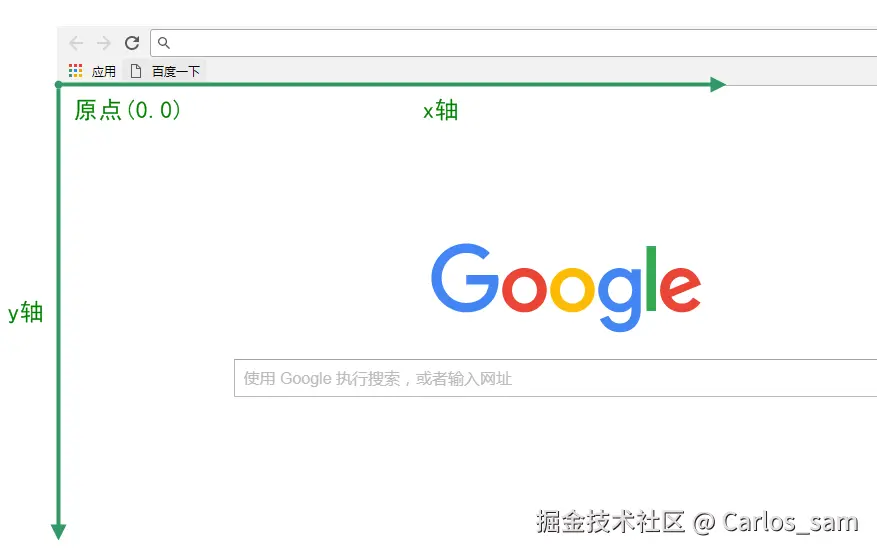 当我们将点和距离都转换为像素单位后,坐标就需要遵循屏幕坐标系,屏幕坐标系是以屏幕左上角为原点,向右为x周正方形,向下位y轴的正方向。
